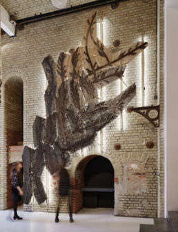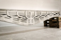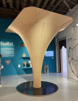 The project, developed by the Centre for Information Technology and Architecture (CITA) at the Royal Danish Academy, explores the use of biopolymer composites derived from agricultural waste streams to create a 3D printed wall paneling system. The composite material consists of bone glue, a by-product of the meat industry, combined with cellulose fibres from various waste streams. The mixture is robotically 3D printed into filigree leaflike patterns. Due to the thermoplastic properties of bone glue, the material can be reactivated and reshaped by localised heating, facilitating processes such as repair, refurbishment and recycling. Such adaptability supports the principles of circular design by allowing the material to be reused and reconfigured, thereby extending its life cycle and reducing waste. Radicant was part of the Living Prototypes exhibition at Aedes Architecture Forum in Berlin from 10.12.2022 – 25.01.2023.
