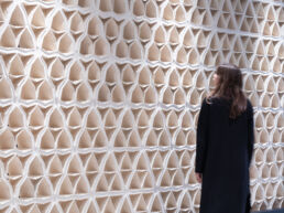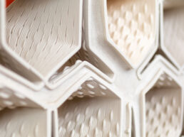 The HIVE project is a 3D printed masonry wall built by a team from the University of Waterloo in Toronto, Canada. Designed by SDI Interior Design for Investment Management Corporation of Ontario, the wall is made of 175 unique 3D printed clay bricks, each designed with different openings to balance privacy and light transmission. The hexagonal aggregation of these units creates a structurally efficient form reminiscent of a honeycomb. The development process involved extensive testing of materials, designs and manufacturing techniques. The team combined traditional ceramic materials with advanced geometric design and robotic precision to achieve the final structure. This approach blends the principles of traditional ceramic craftsmanship with modern technology, allowing for new forms of material expression and geometric complexity in masonry construction.